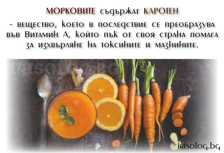 Морковите са много полезни, заради съдържащото се в тях вещество каротен, което в последствие се преобразува във витамин А, който пък от своя страна помага за изхвърляне на токсините и мазнините.
