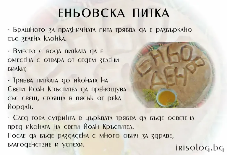 На Еньовден се прави Еньовска питка. Тя трябва да е приготвена: