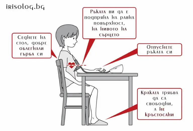 - ръката ви да е подпряна на равна повърхност (например маса), като горната част на ръката е в нивото на сърцето